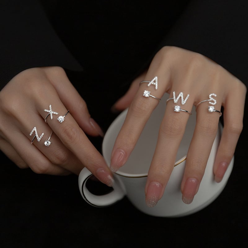きらめくジルコニアと英小文字イニシャルが指先を上品に彩るシルバーリング。