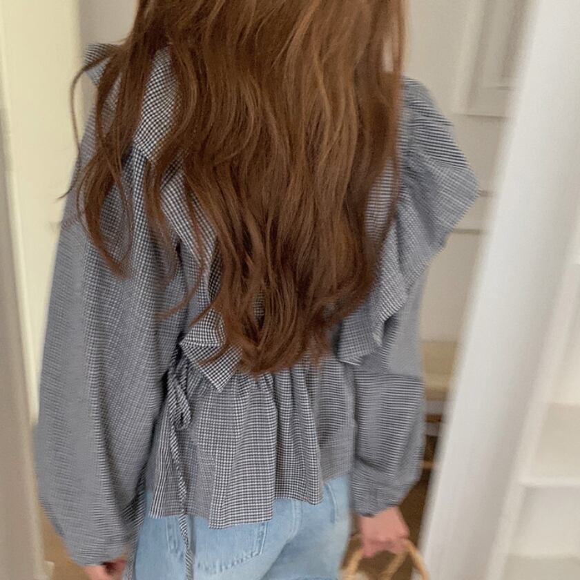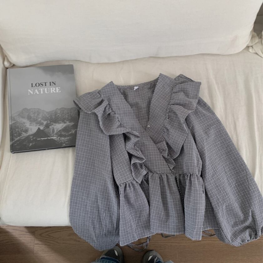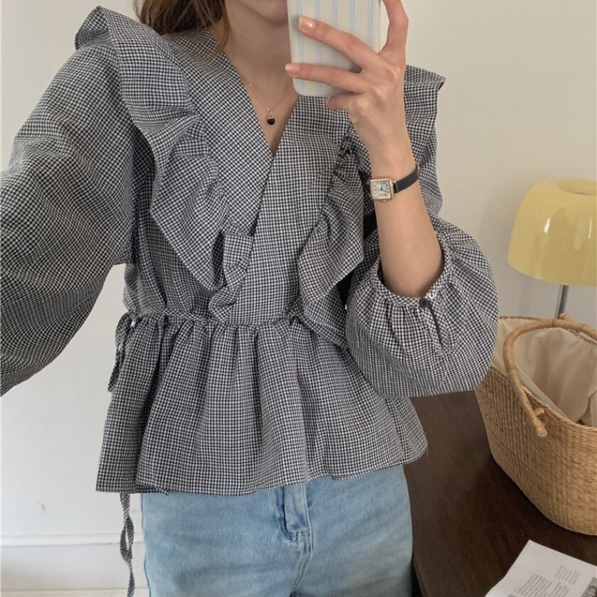 V-neck ruffle plaid long sleeve tops m0209