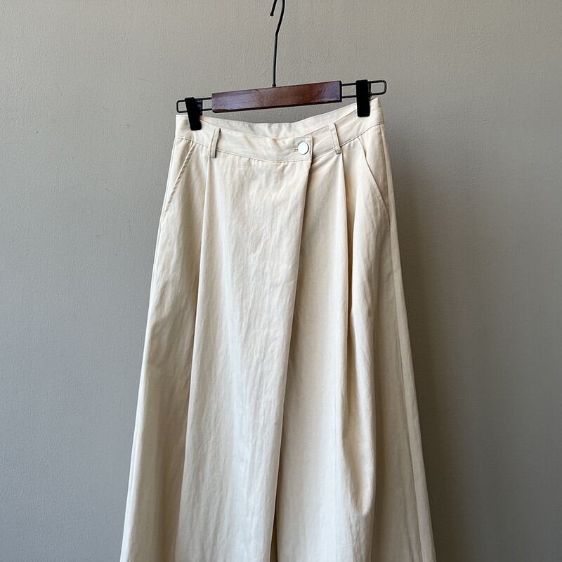 非対称な前立てが、シンプルなトップスとの相性を抜群にします。