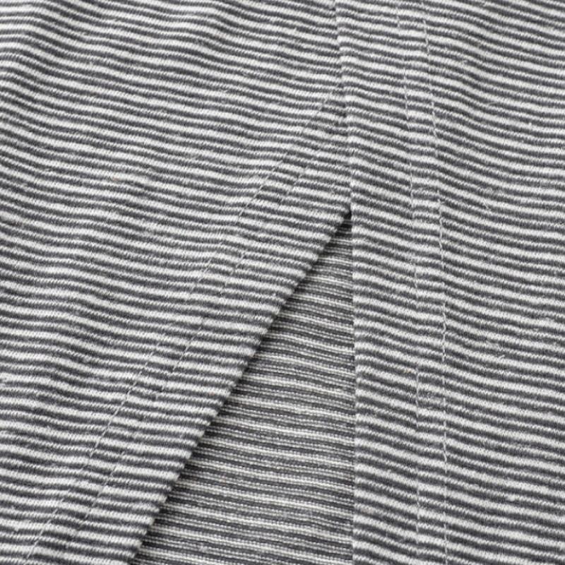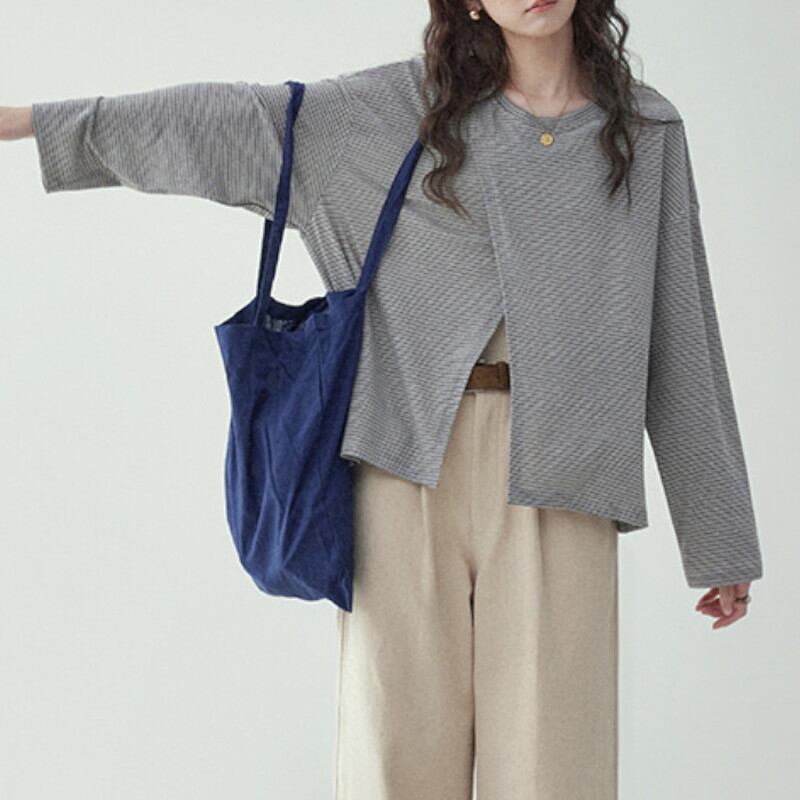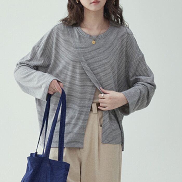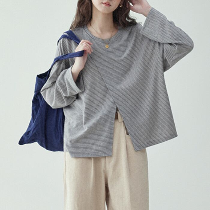 シンプルでありながら個性的なデザインが特徴のアシンメントリースリットストライプトップ。