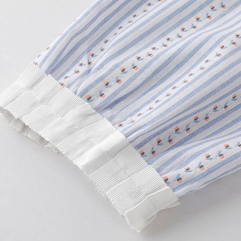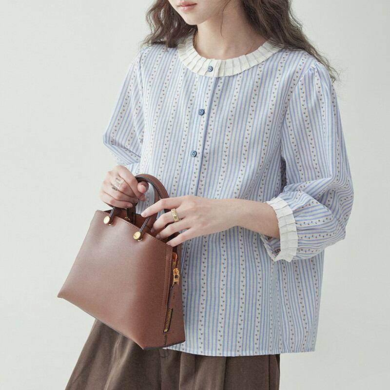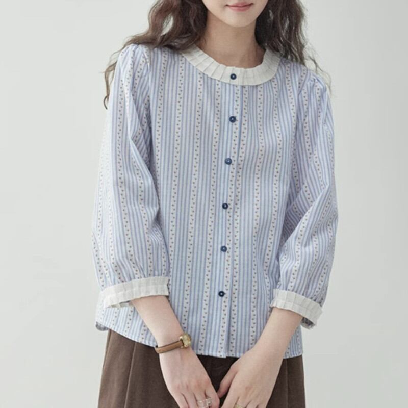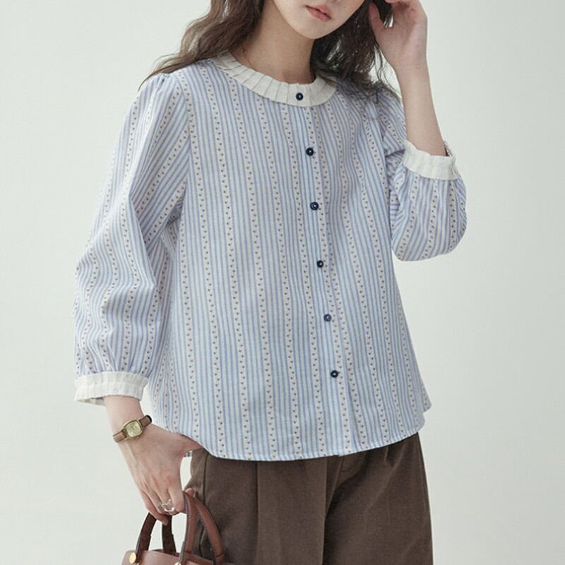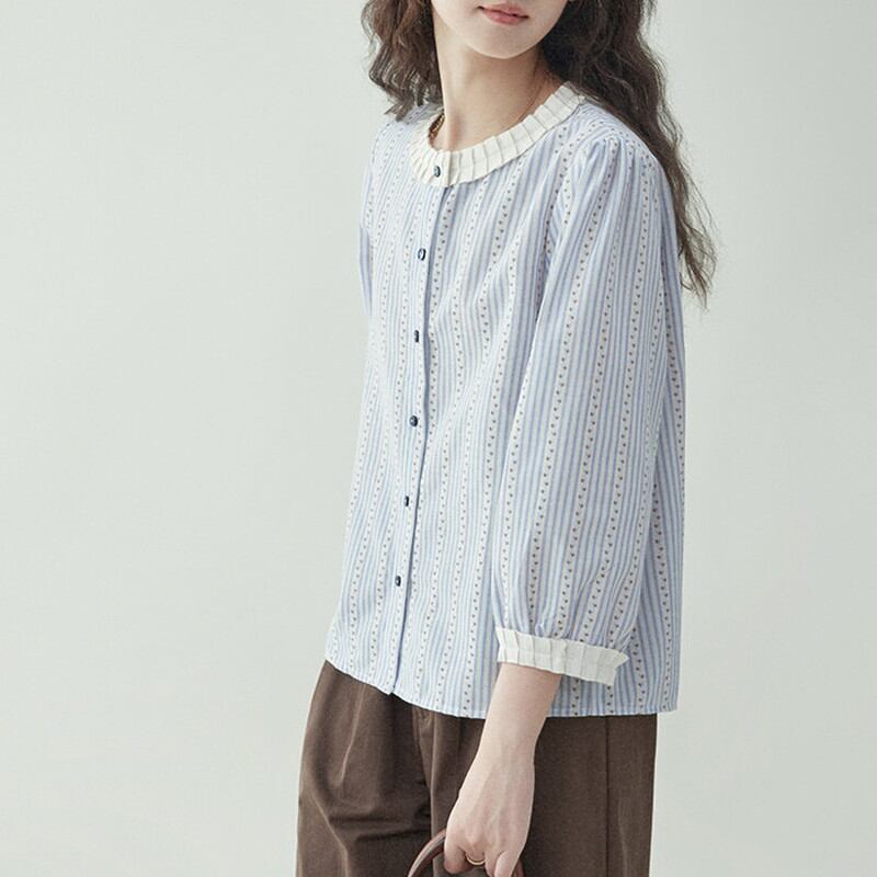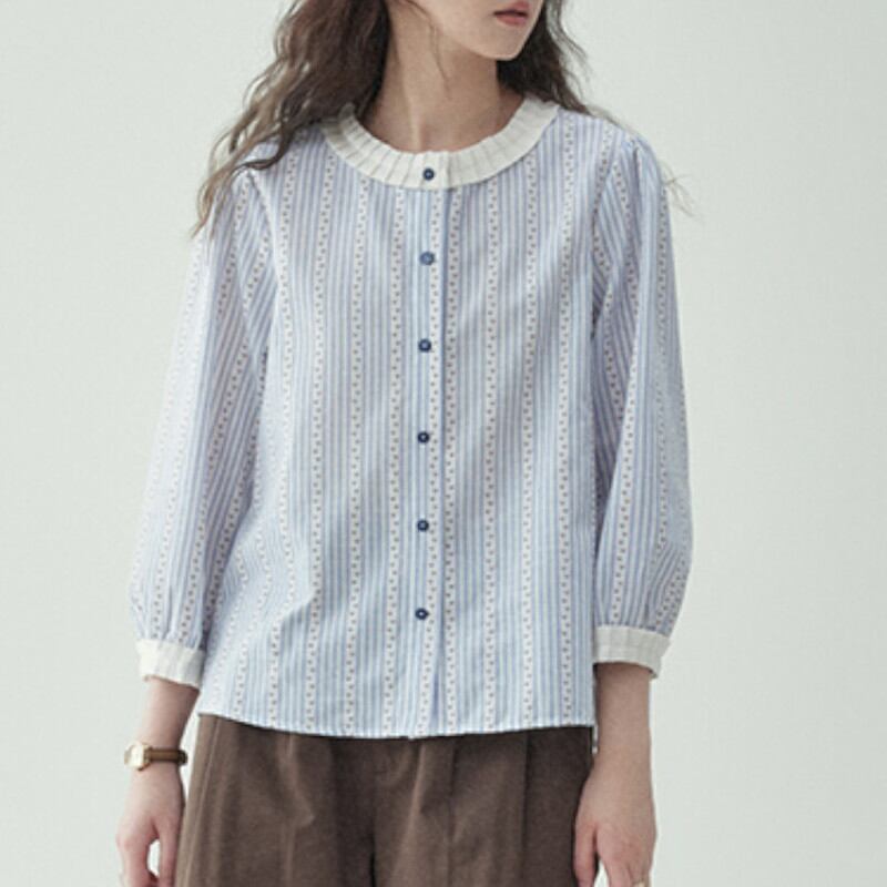 エレガントで上品な印象を与える、ブルーストライプレースエッジブラウス。