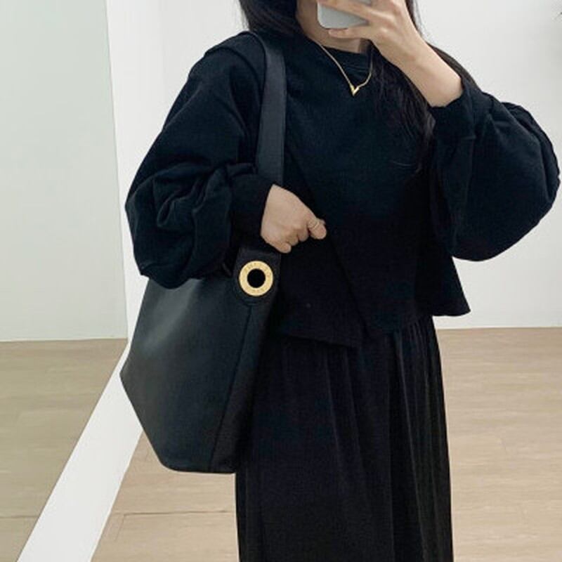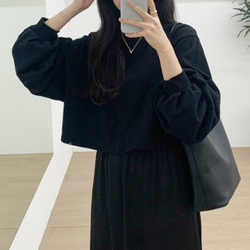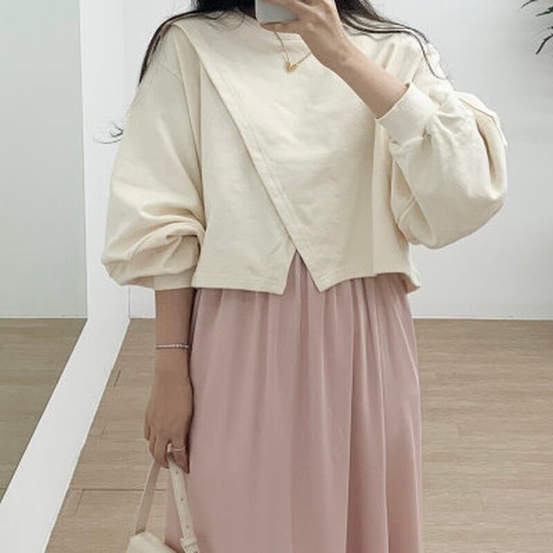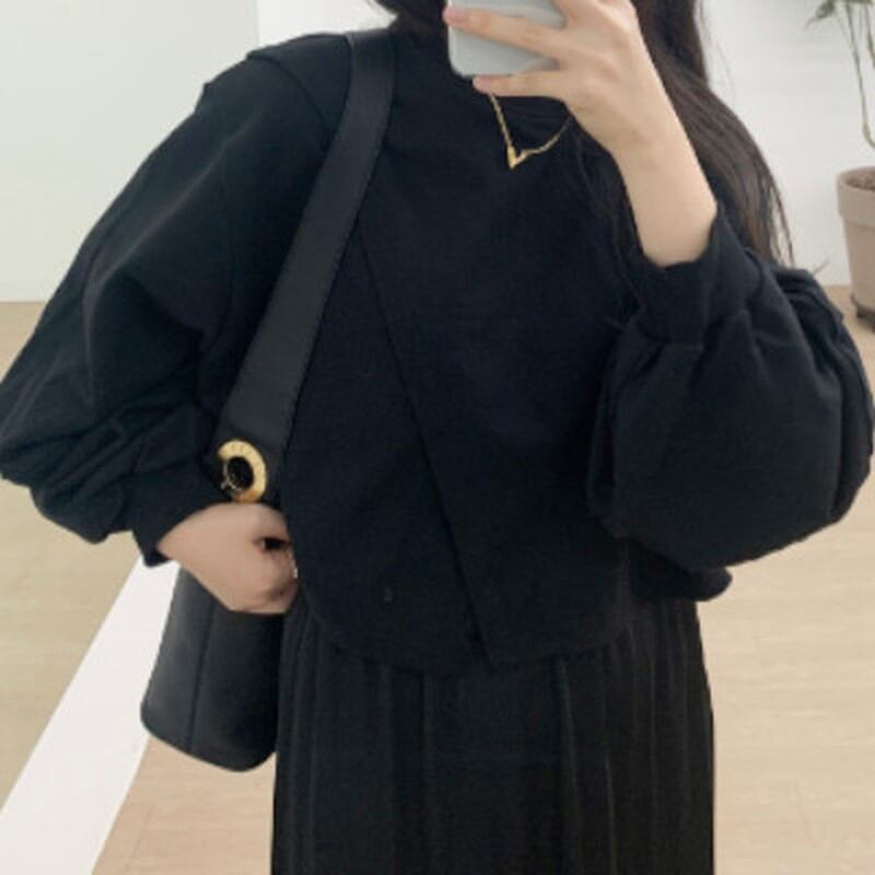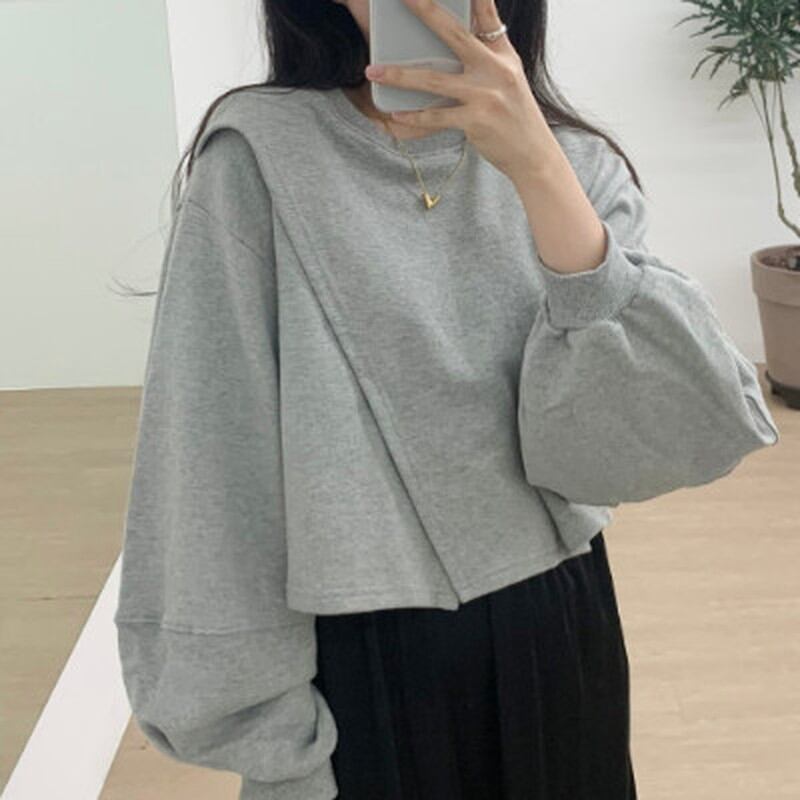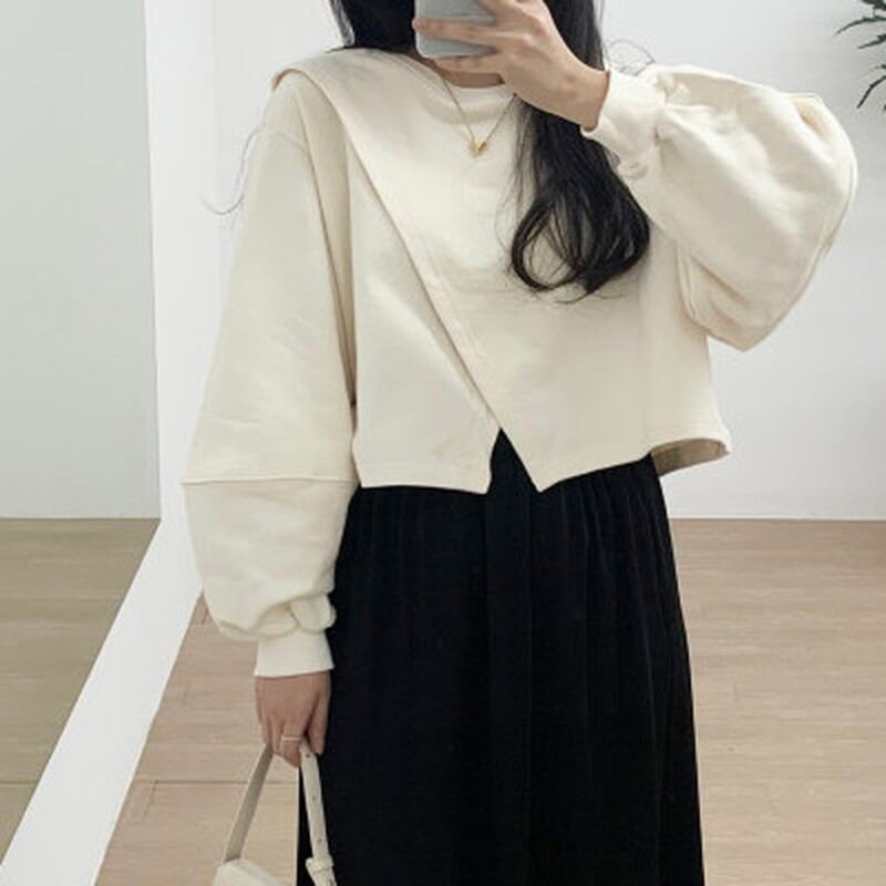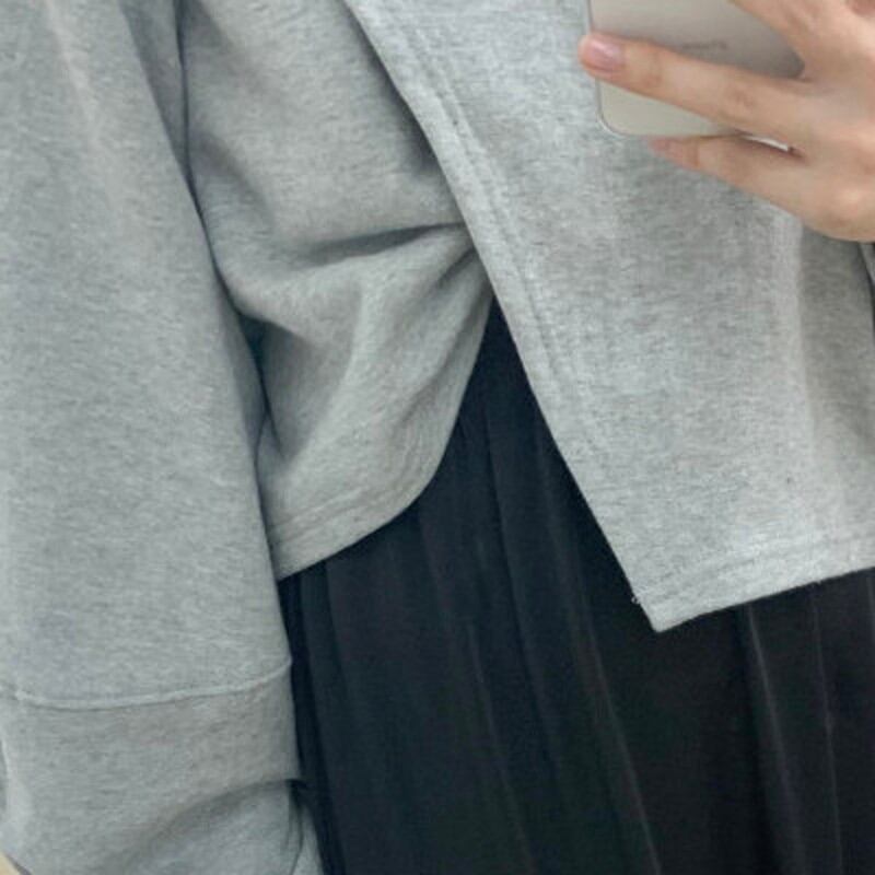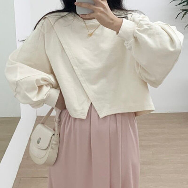 ボリュームのある袖と、左右非対称な前立てが印象的なスウェットシャツ。