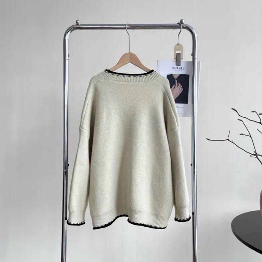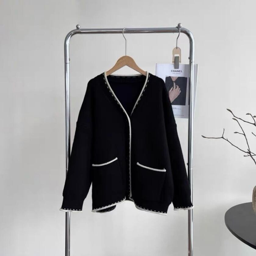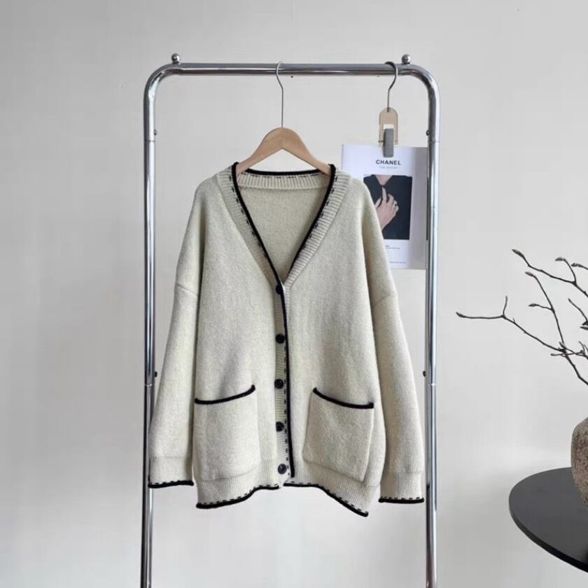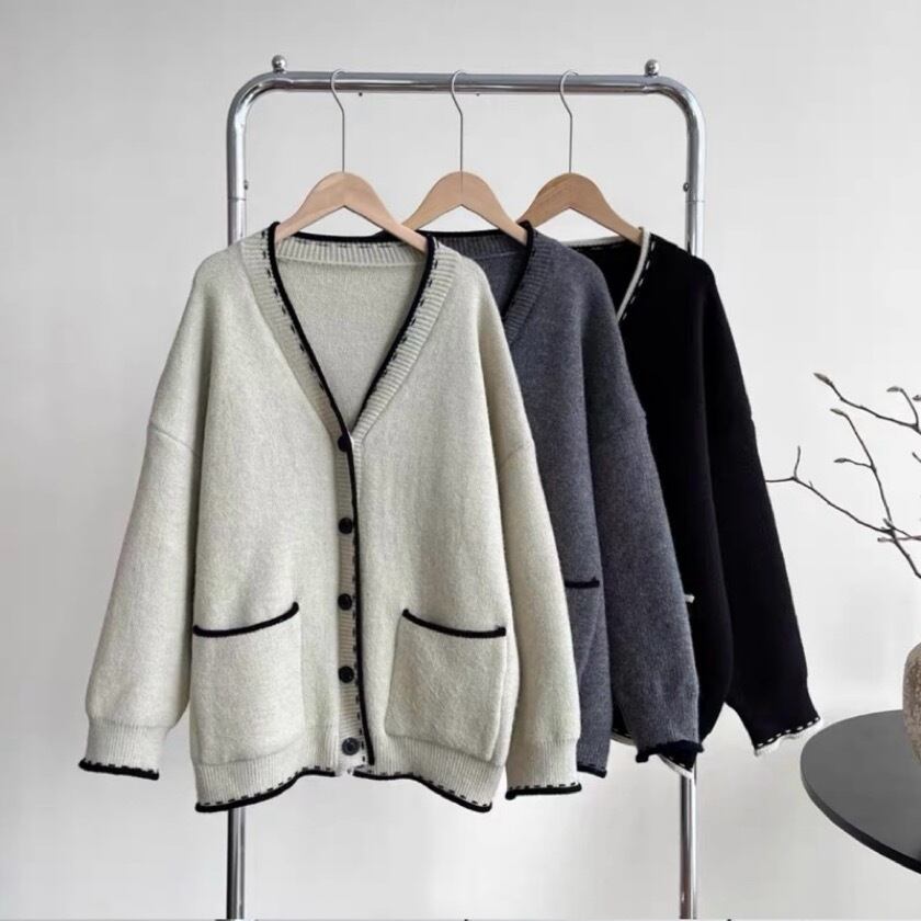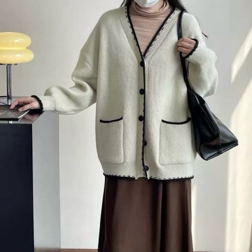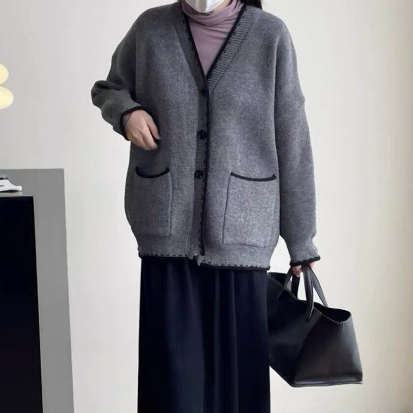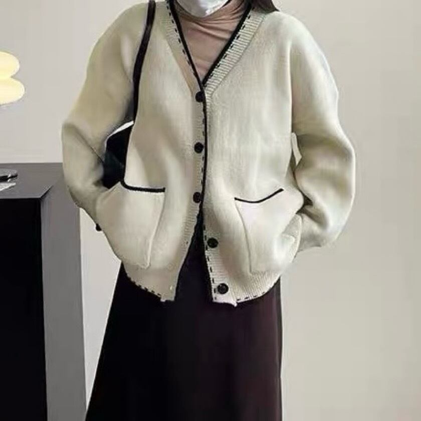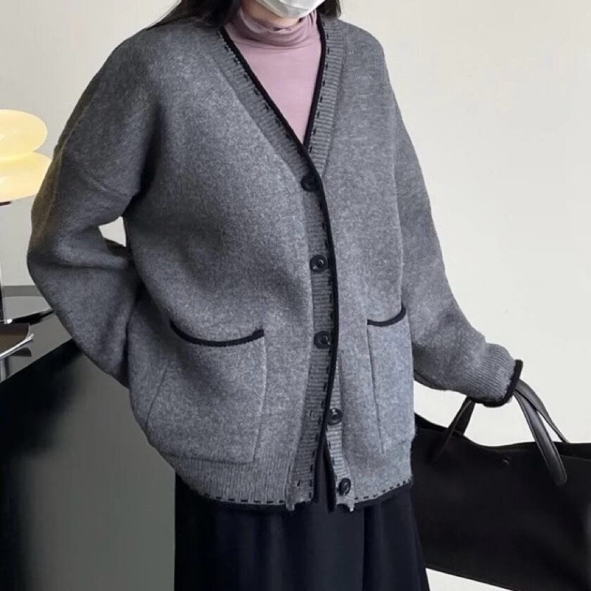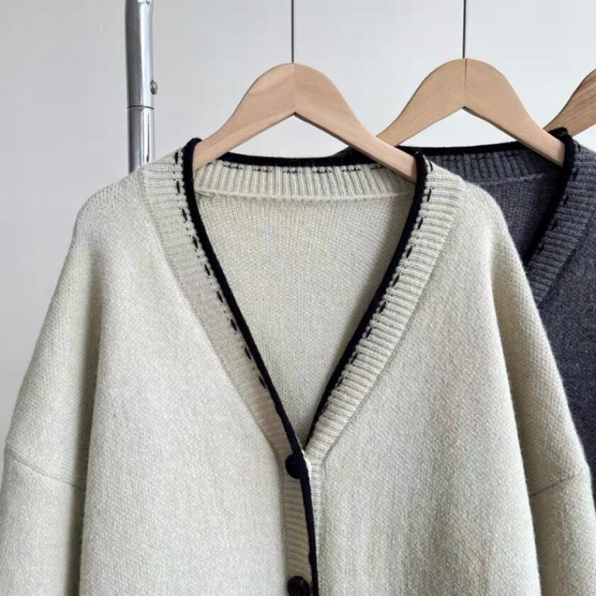 シンプルでありながら洗練されたデザインが特徴のバイカラーステッチVネックカーディガン。