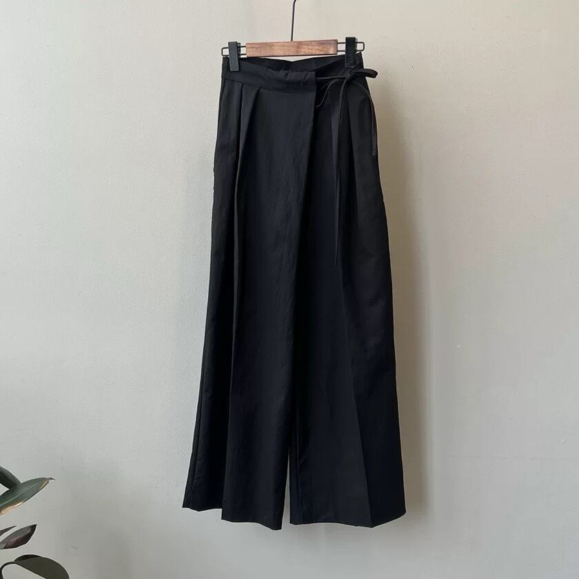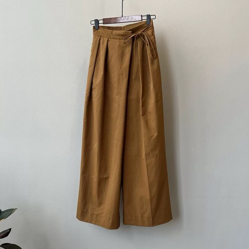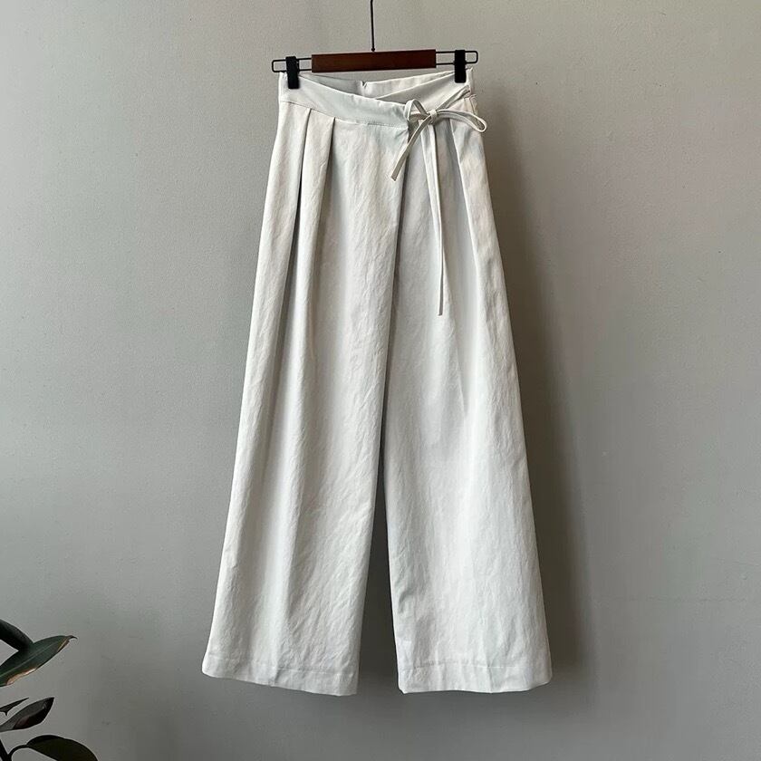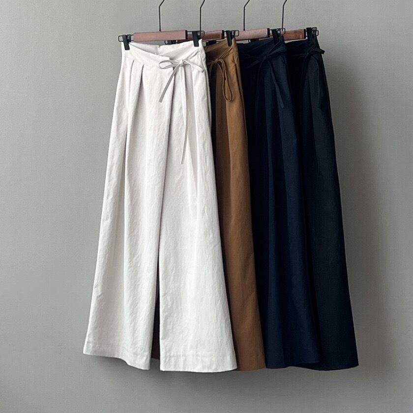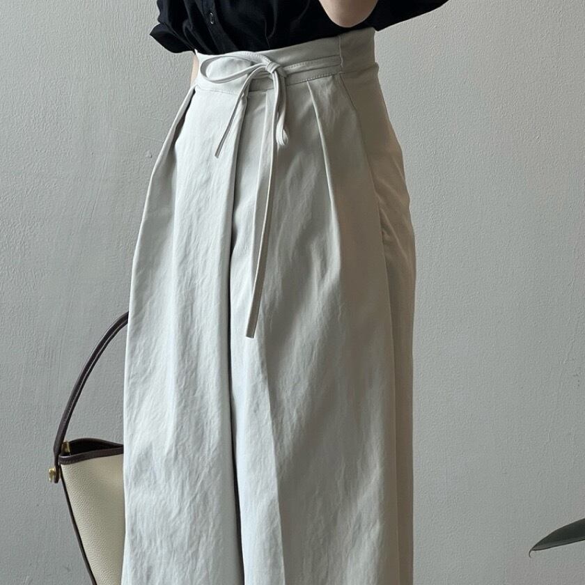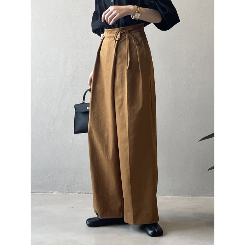 ウエストのリボンベルトがアクセントのタックワイドパンツ。