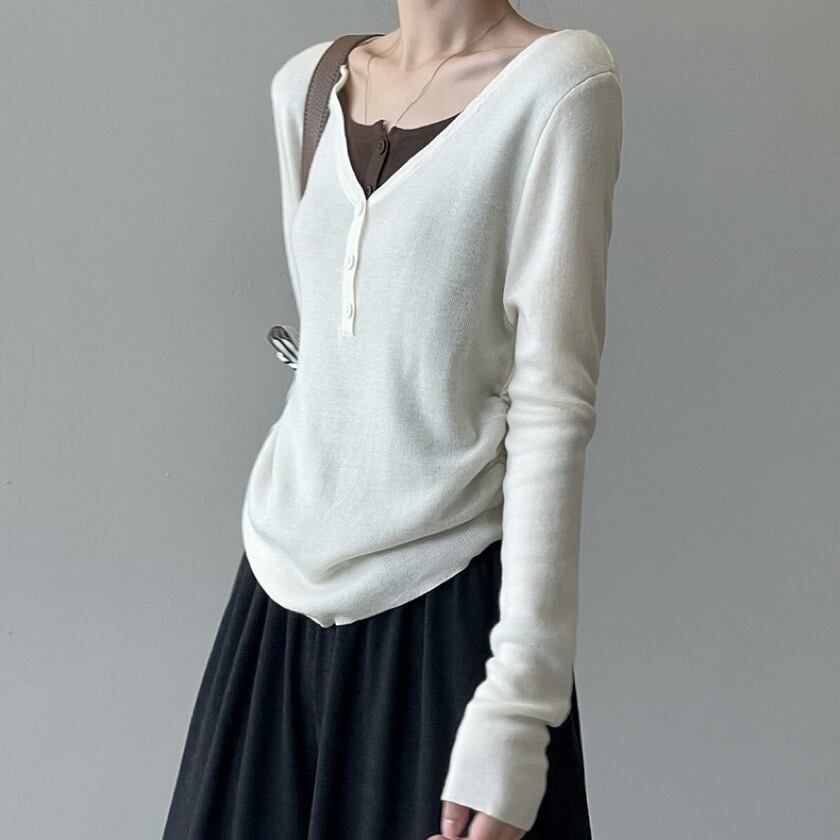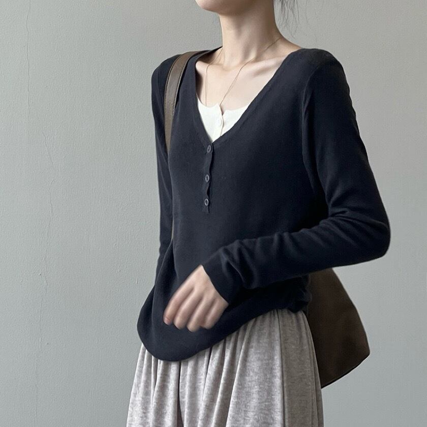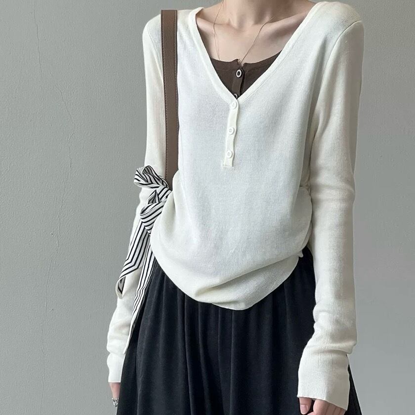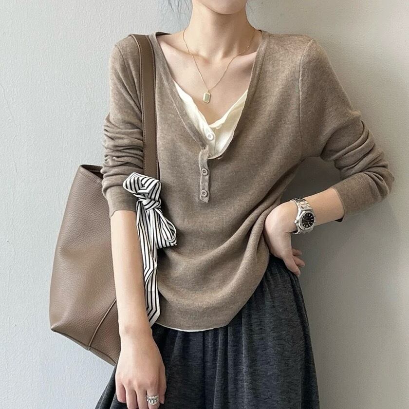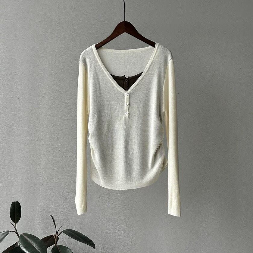 レイヤード風のデザインが魅力のVネックニットトップス。