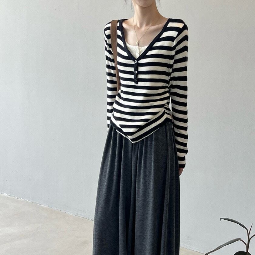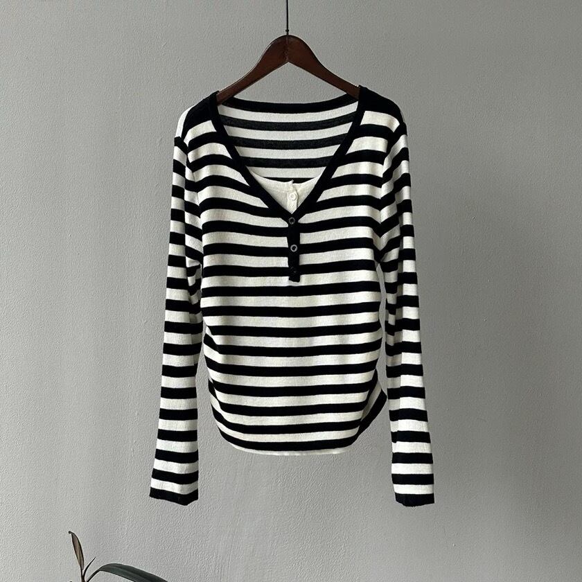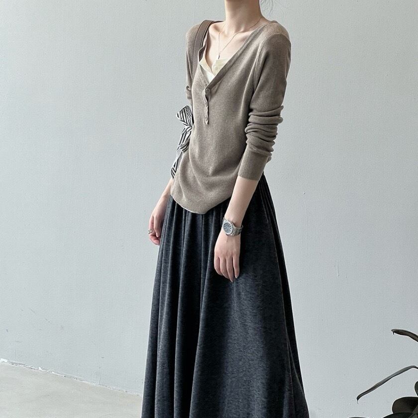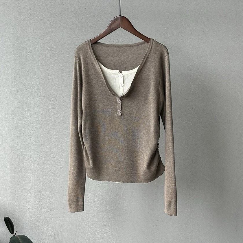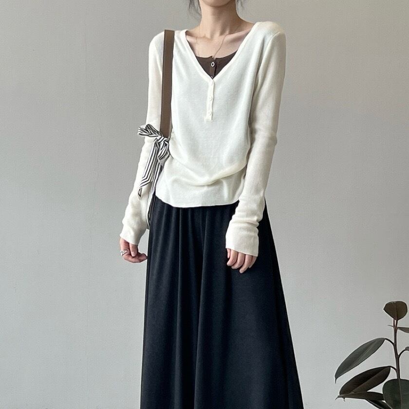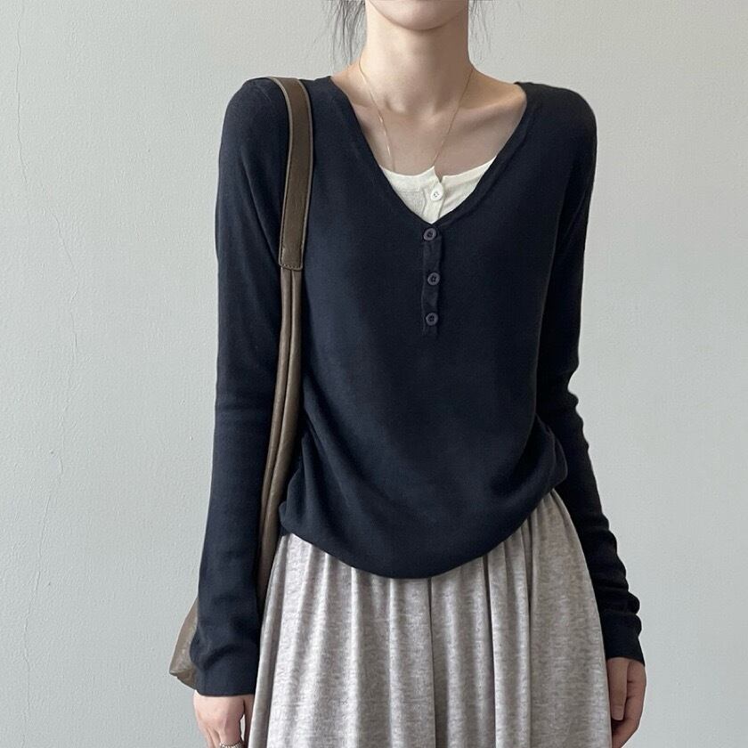 レイヤード風のデザインが魅力のVネックニットトップス。