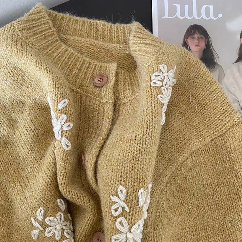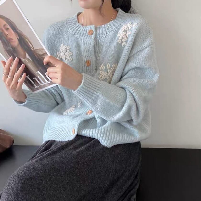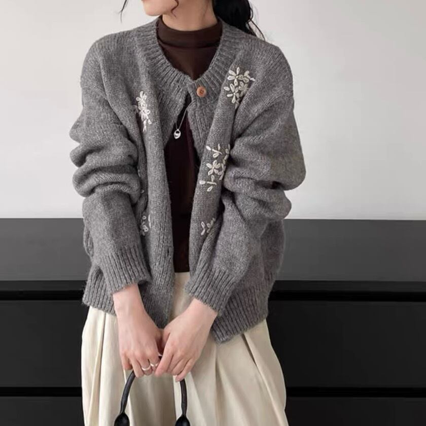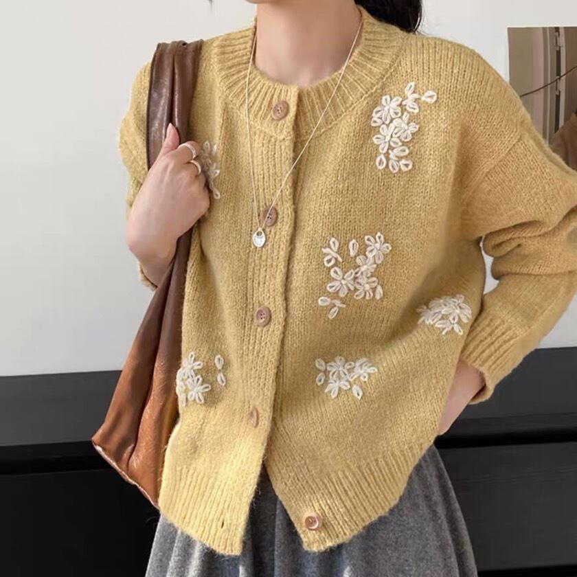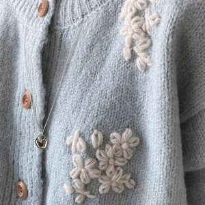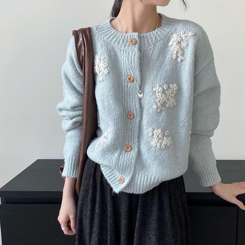 柔らかな素材に、可愛らしい花柄刺繍が施されたラウンドネックカーディガン。