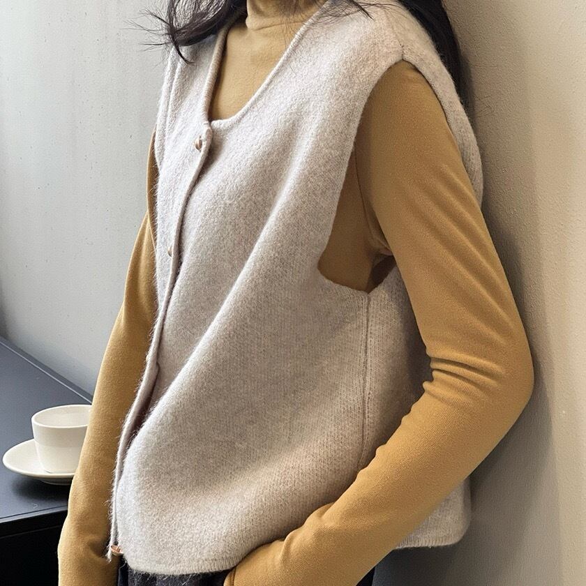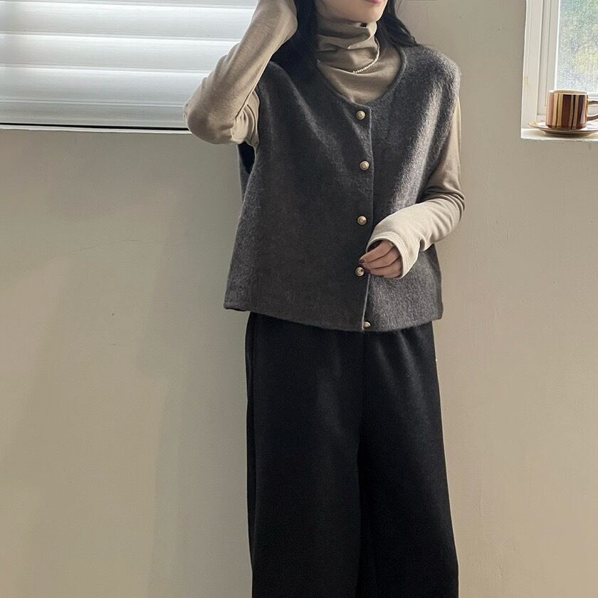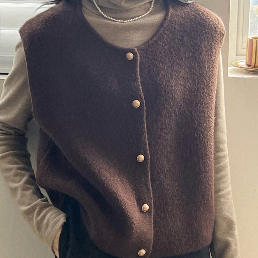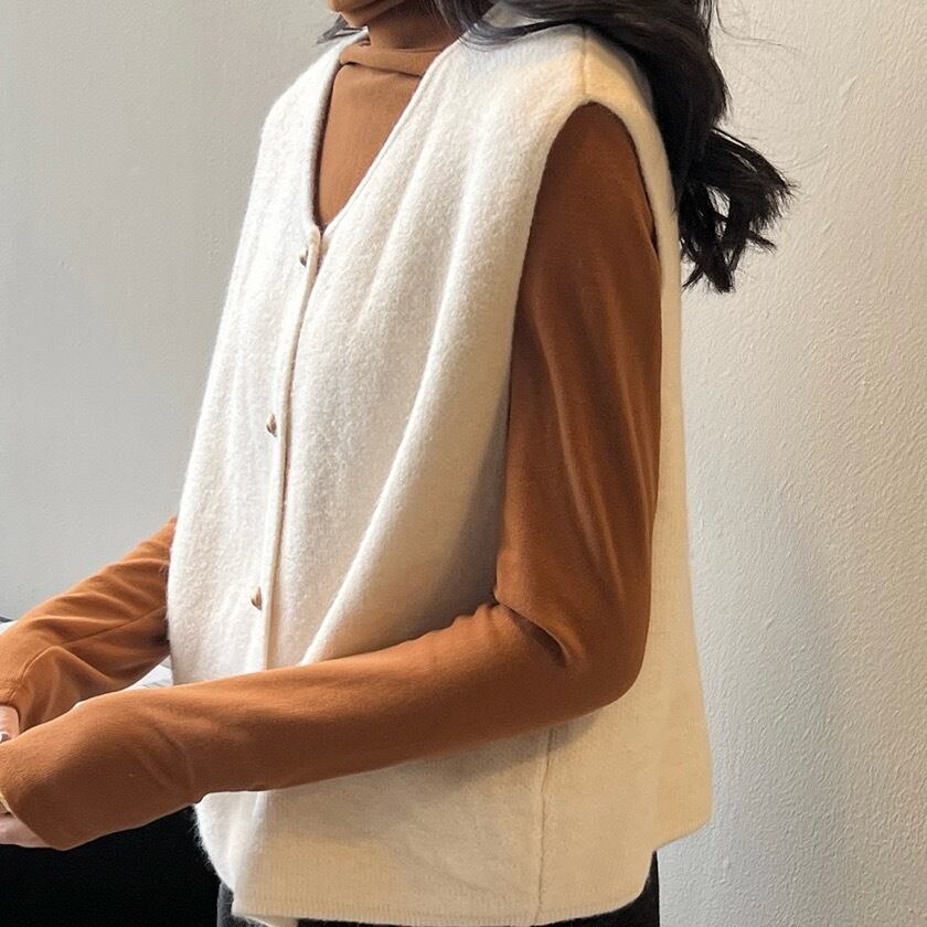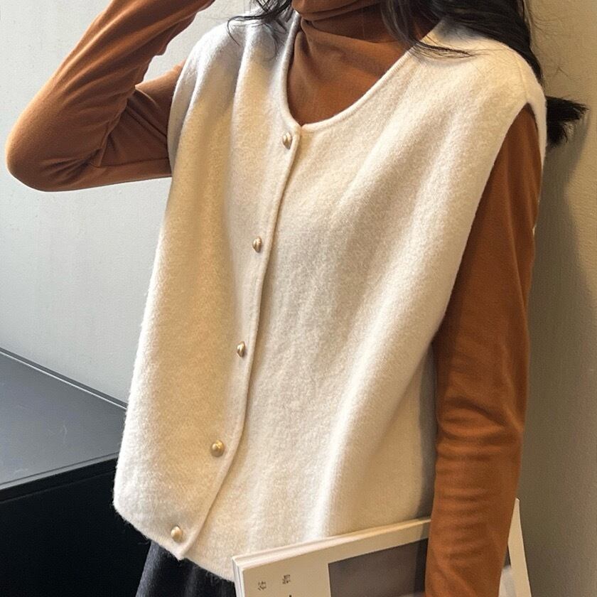 快適な着心地を追求したゴールドボタンラウンドネックニットベスト。