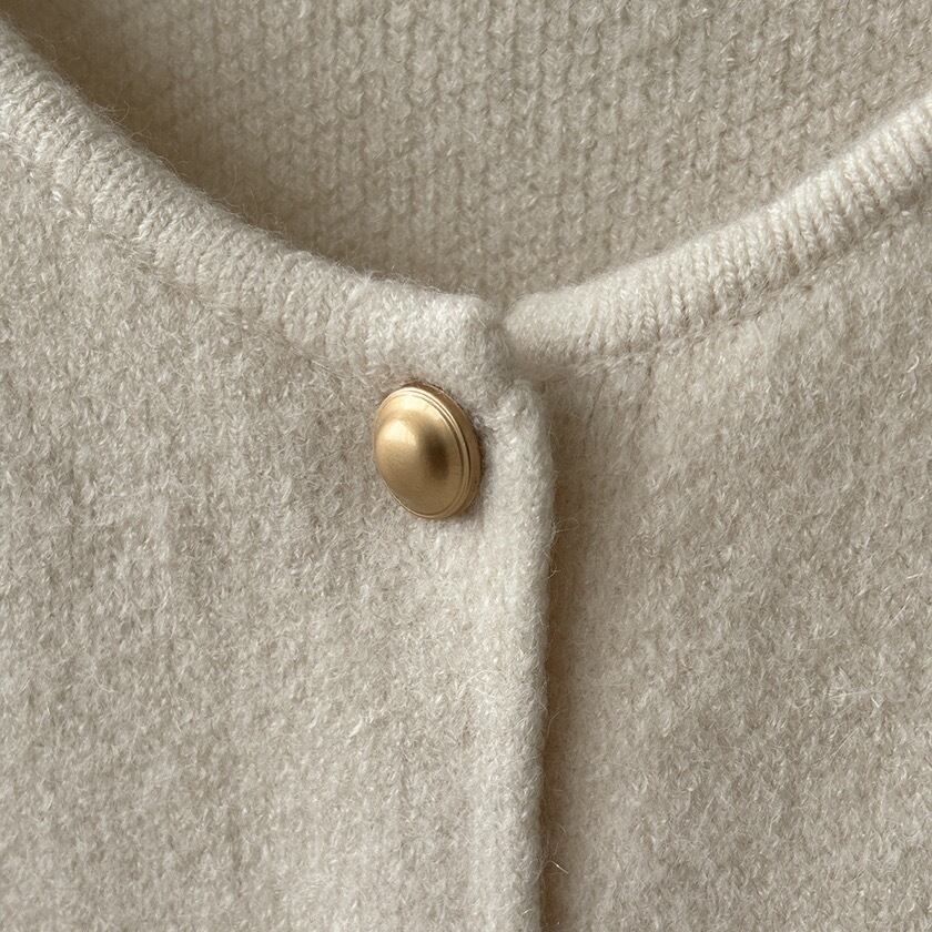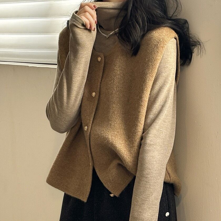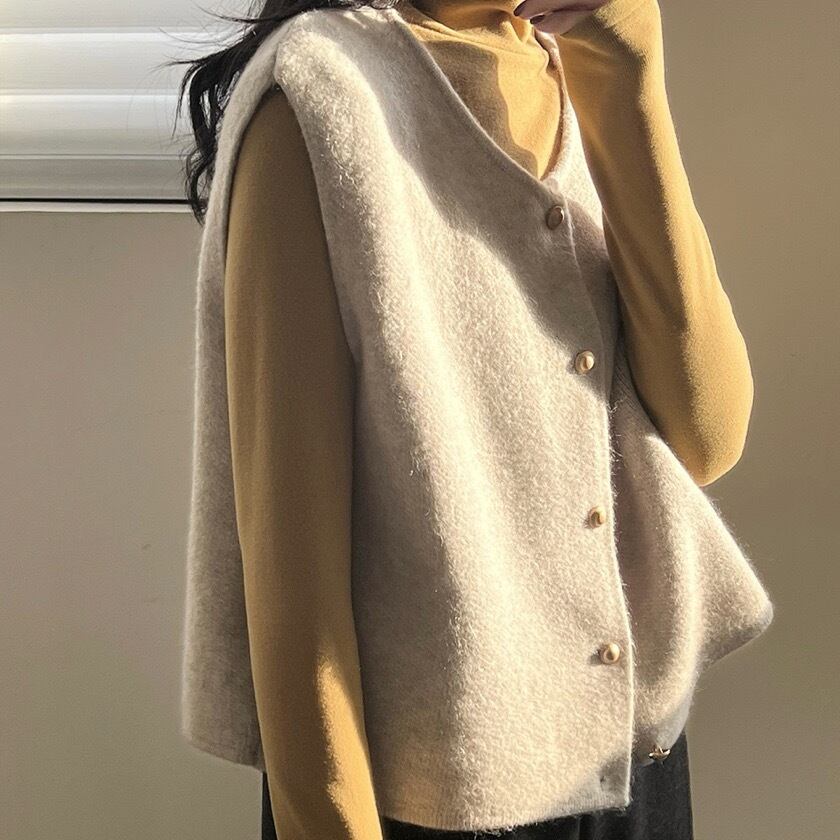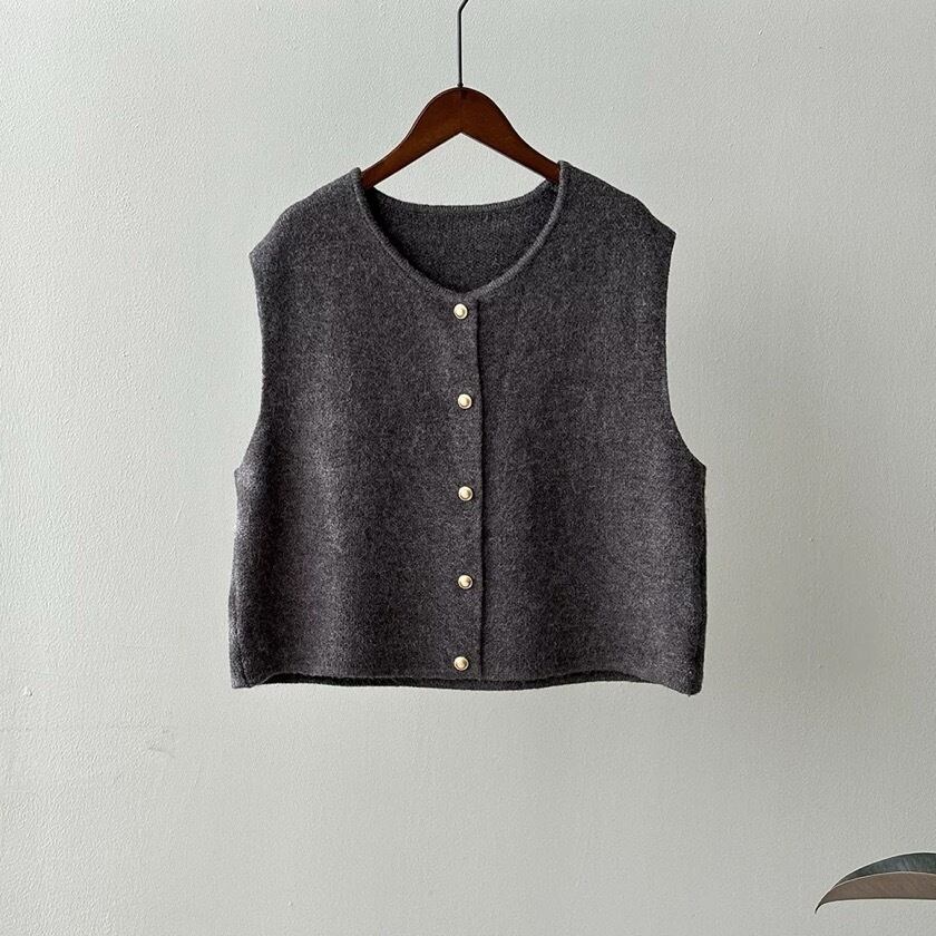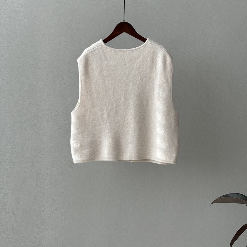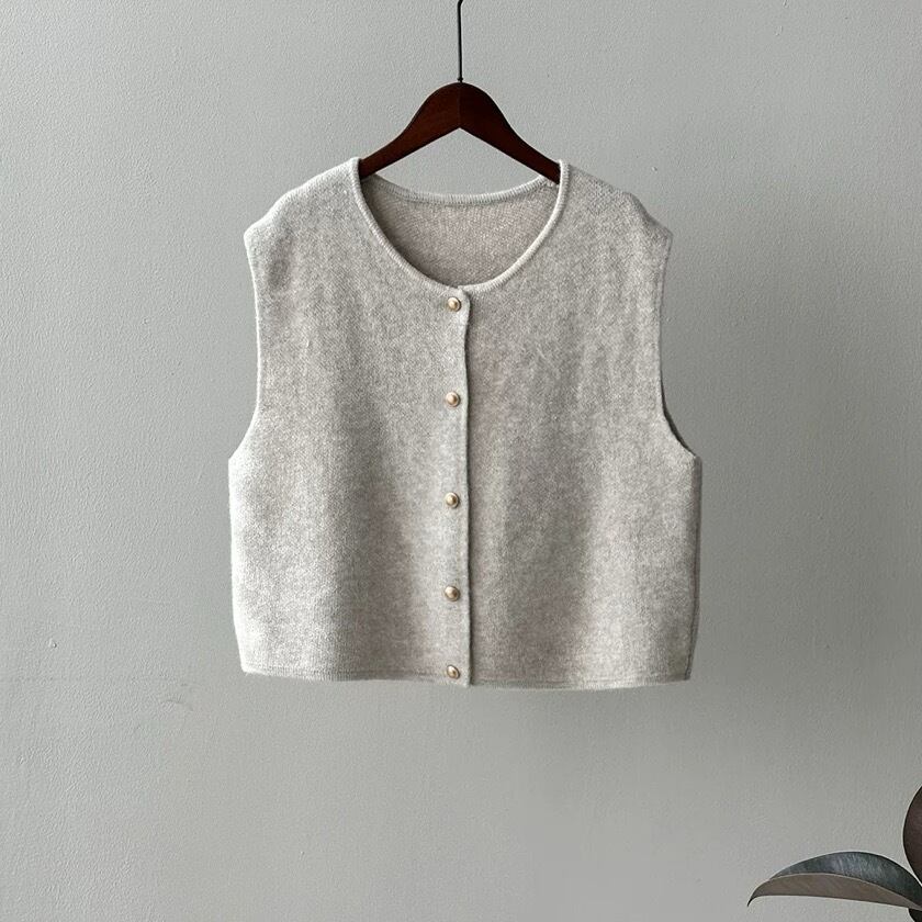 快適な着心地を追求したゴールドボタンラウンドネックニットベスト。
