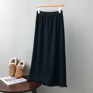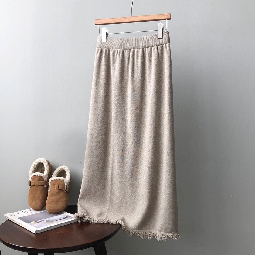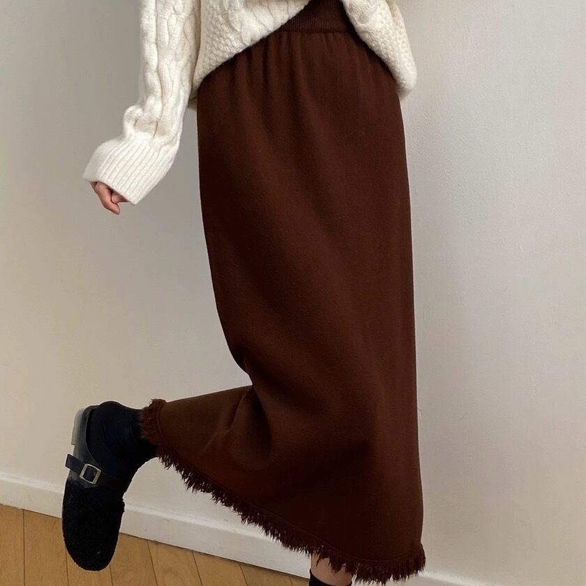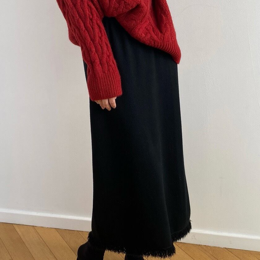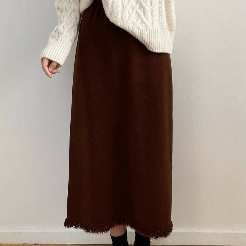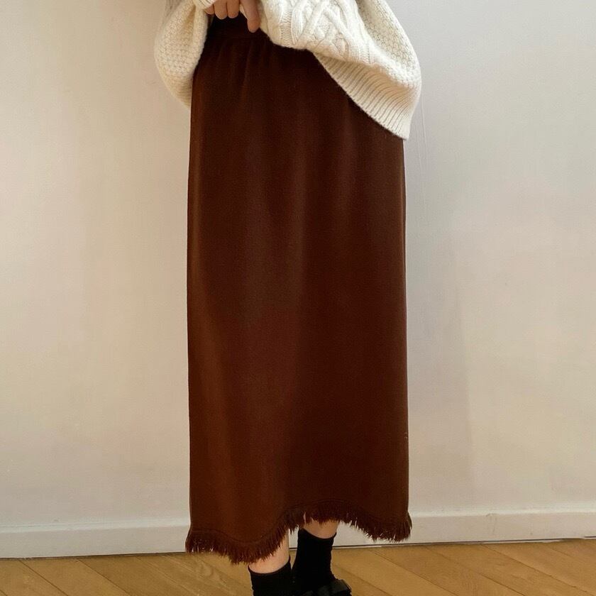 快適な着心地を大切にしたフリンジニットAラインロングスカート。
