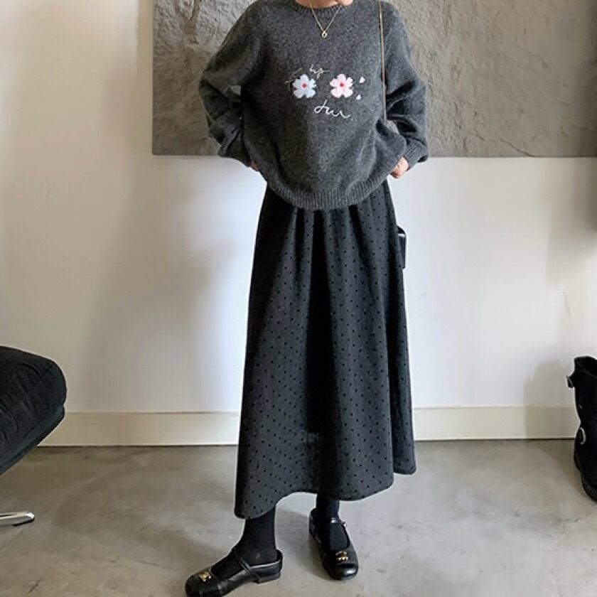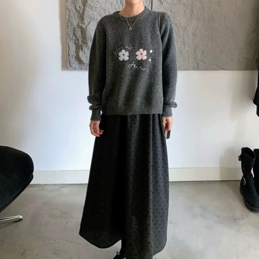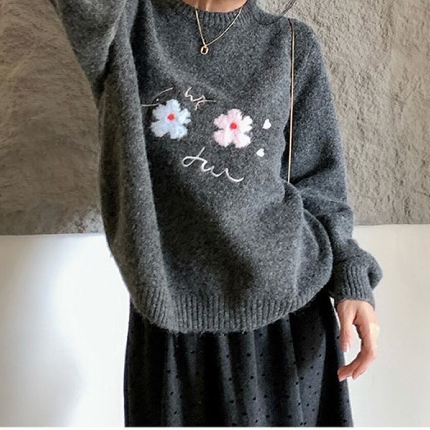 洗練されたデザインが魅力のフラワーパターン刺繍ラウンドネックニットセーター。