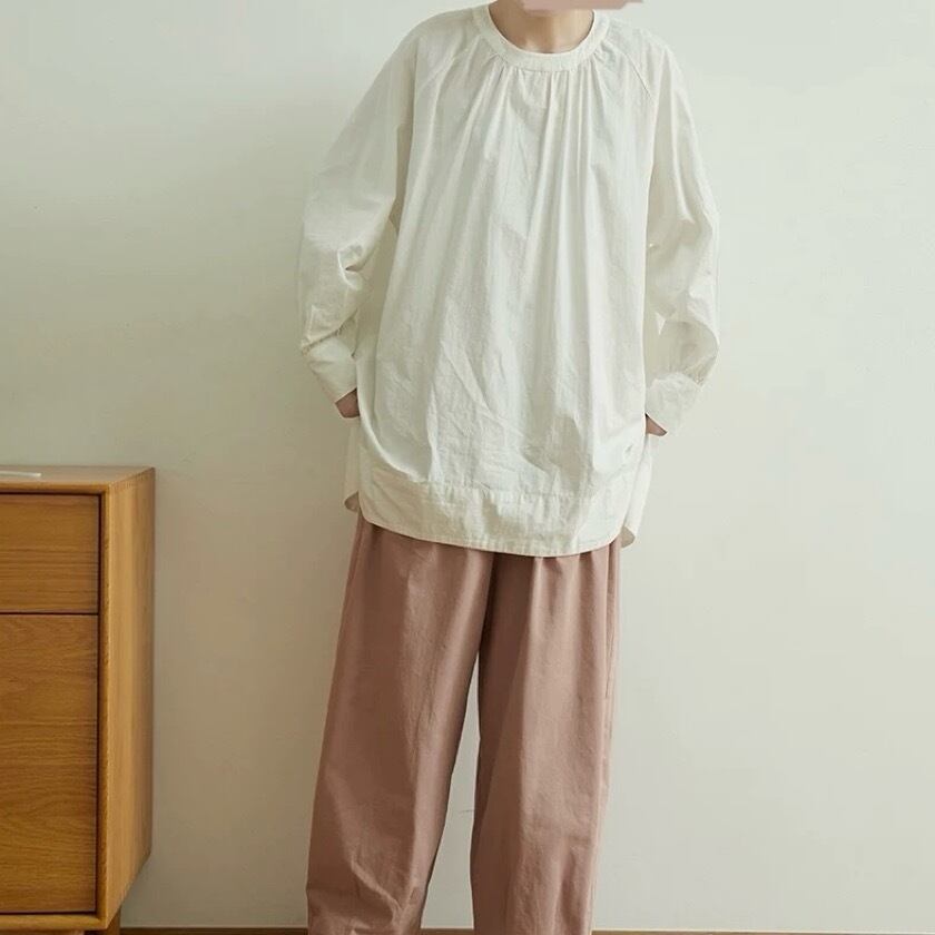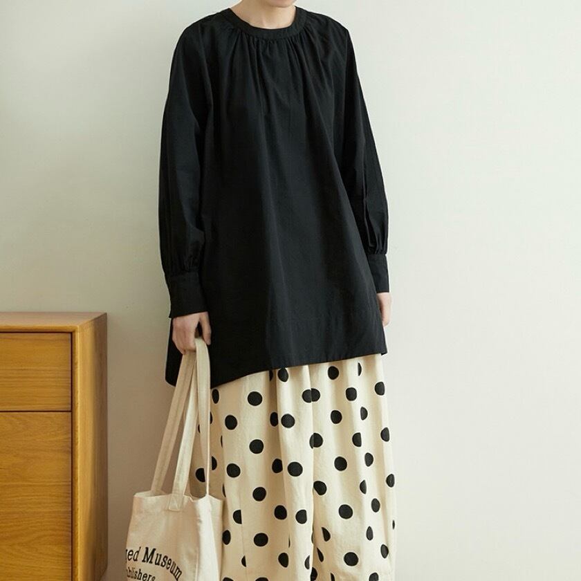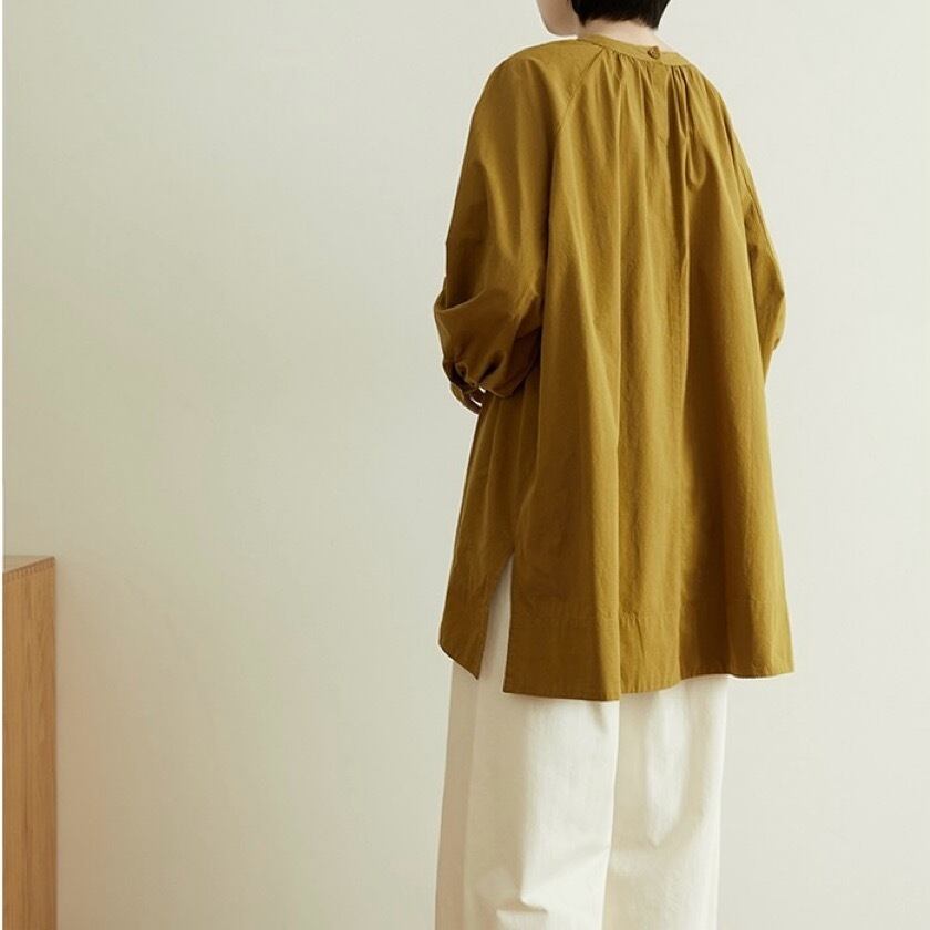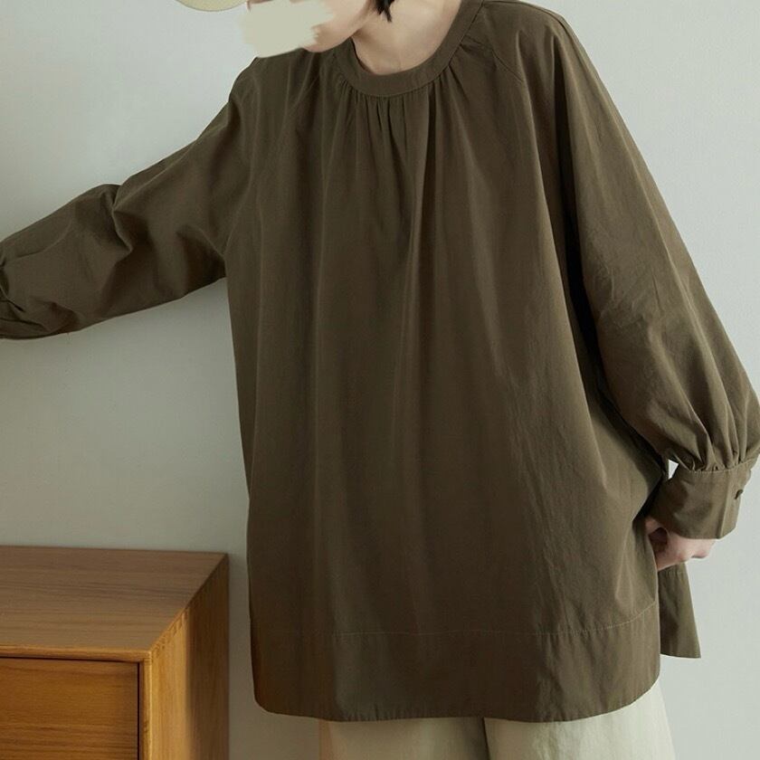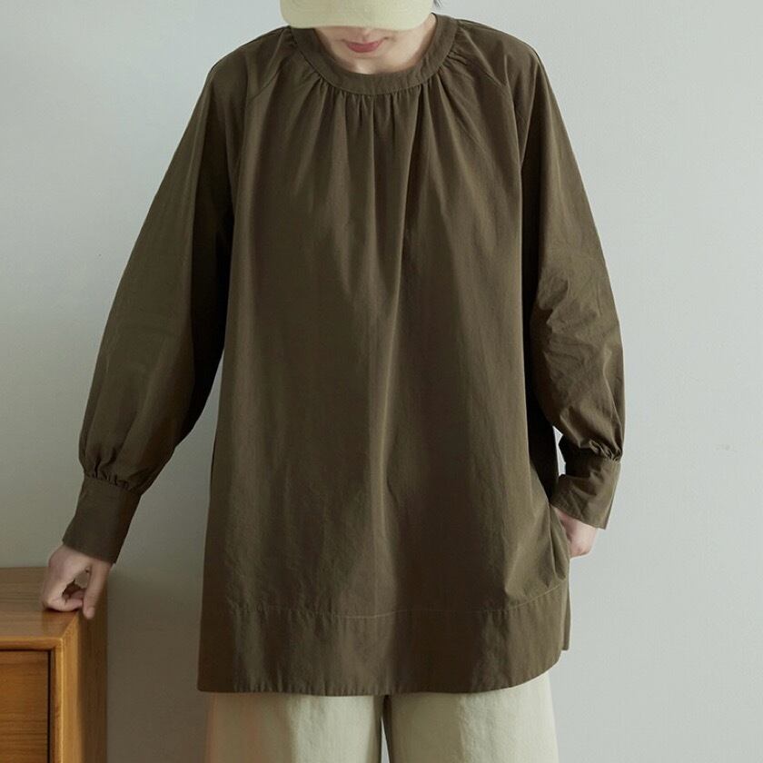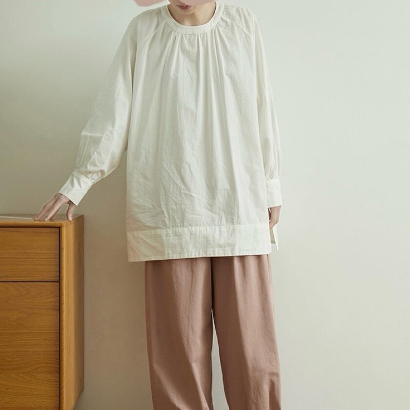 カジュアルさとエレガンスを兼ね備えたラウンドネックシャツチュニック。