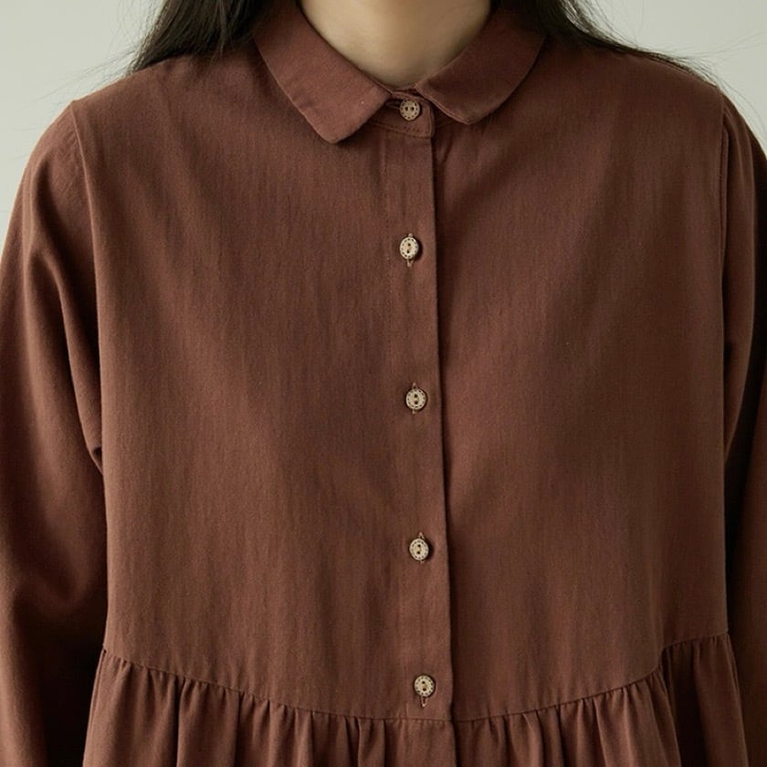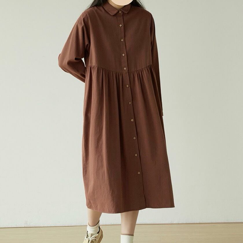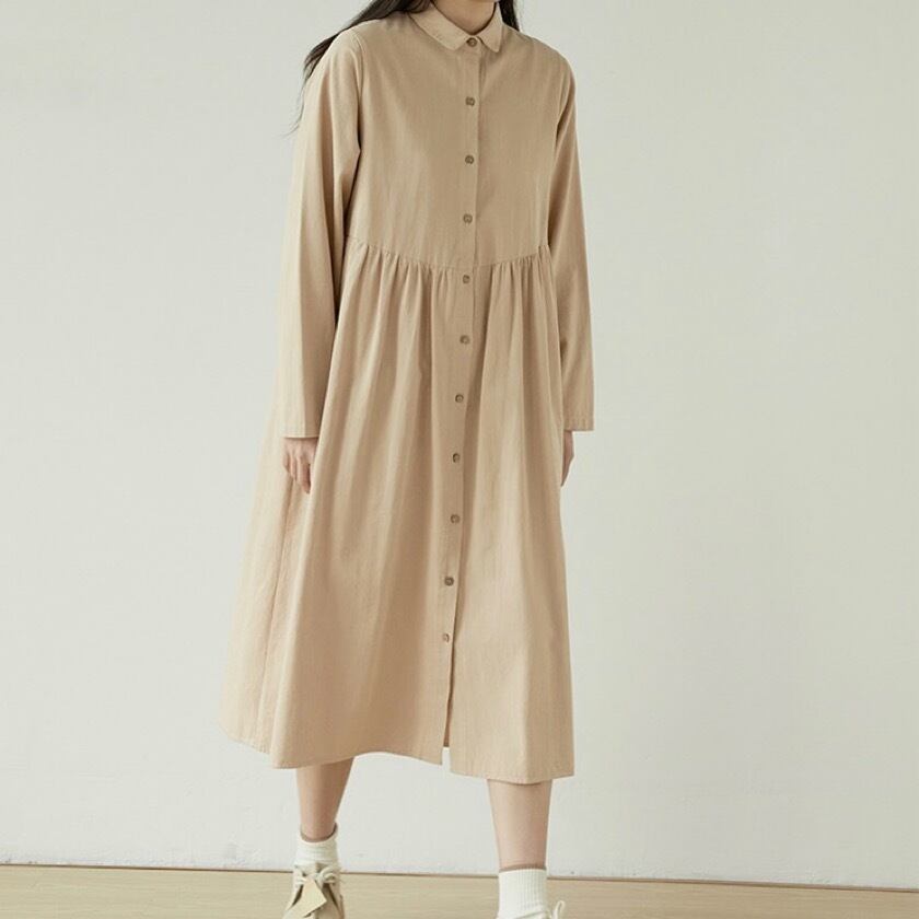 カジュアルでありながら、女性らしさを引き立てるフロントボタン ギャザー シャツワンピース。