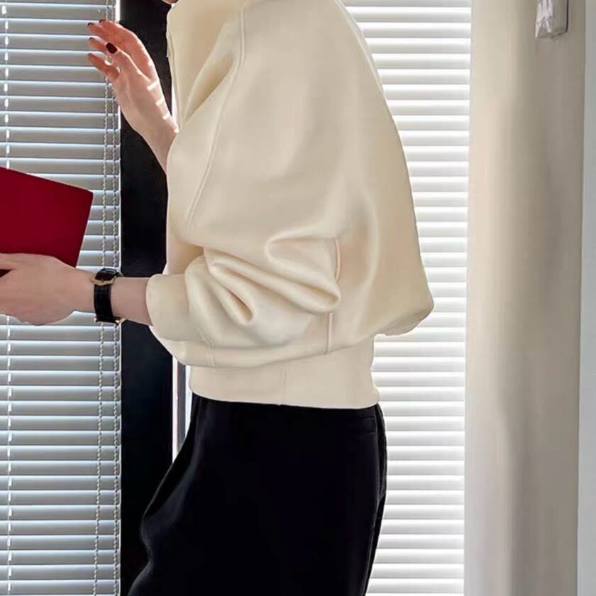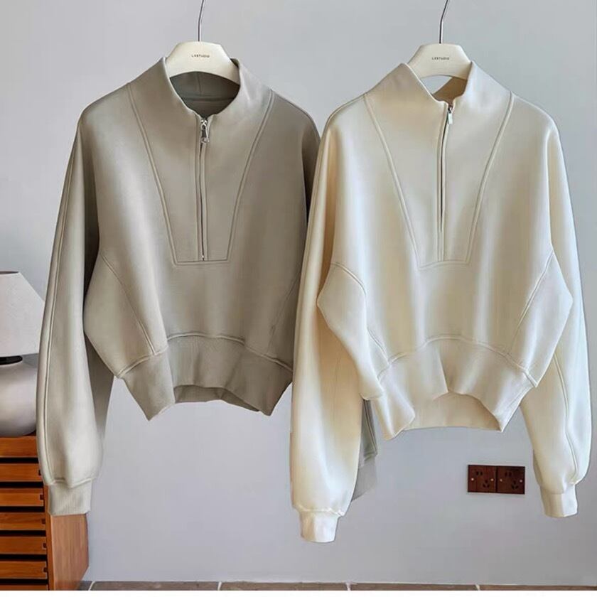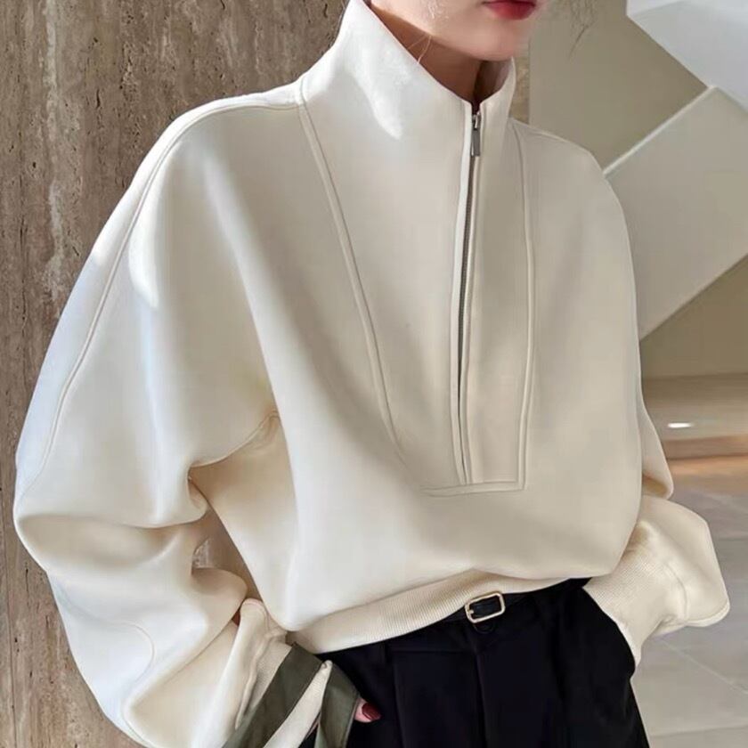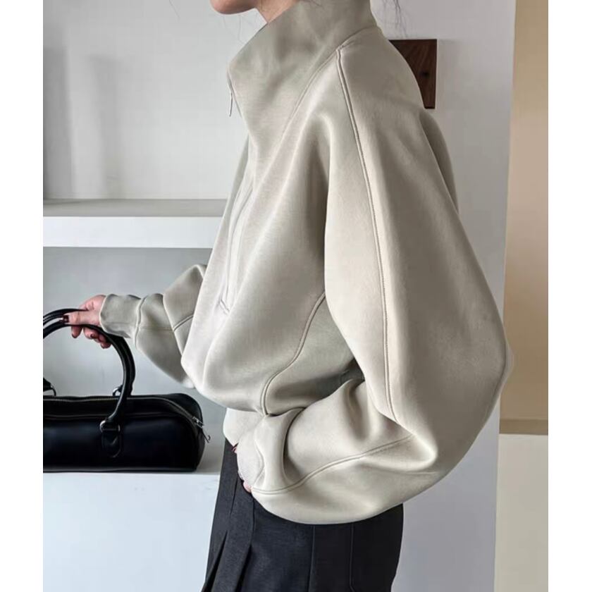 ハーフジップ仕様で、気軽に着脱でき、オーバーサイズがリラックスした雰囲気を演出します。普段使いはもちろん、リモートワークやちょっとしたお出かけにもぴったりです。