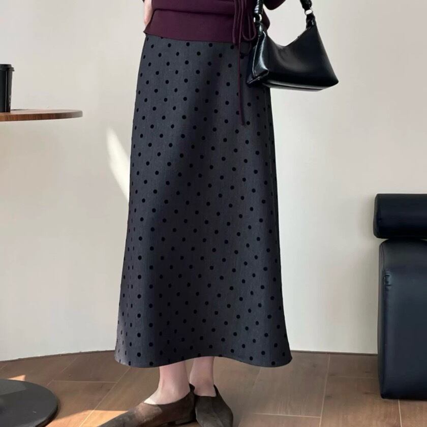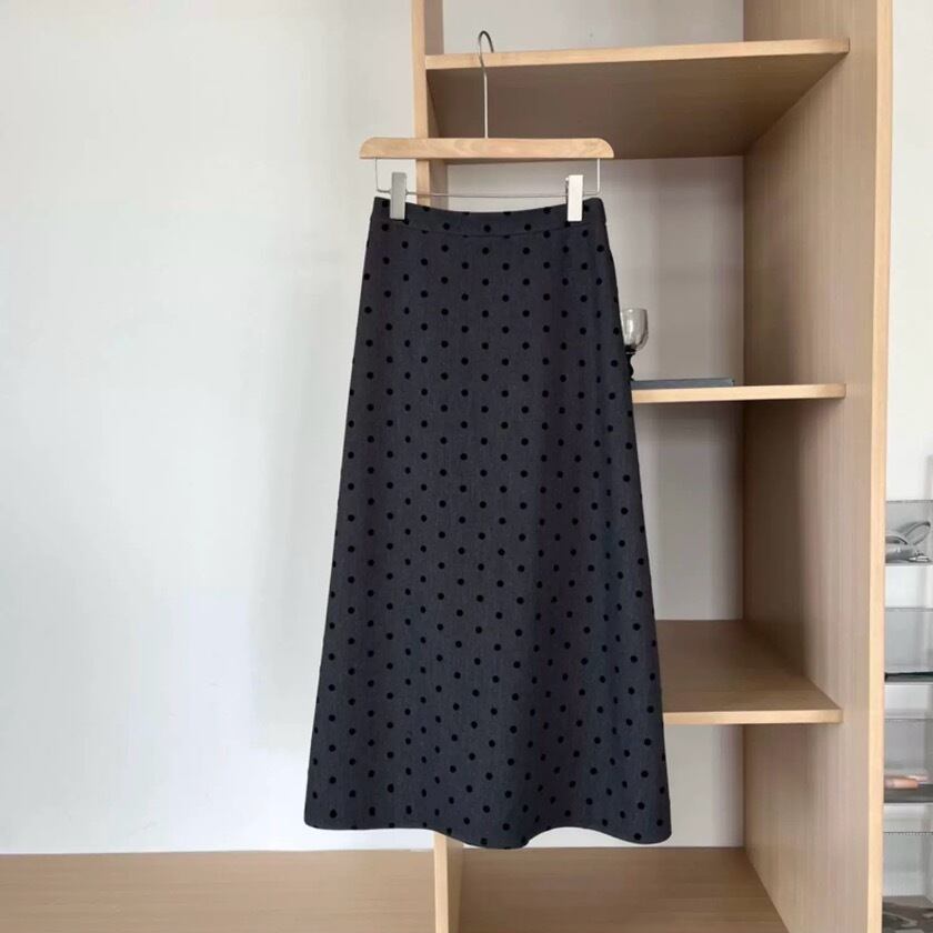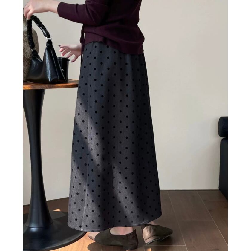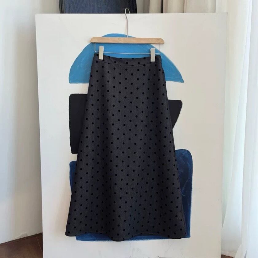 ドット柄が可愛いAラインロングスカートで、女性らしいシルエットを演出します。